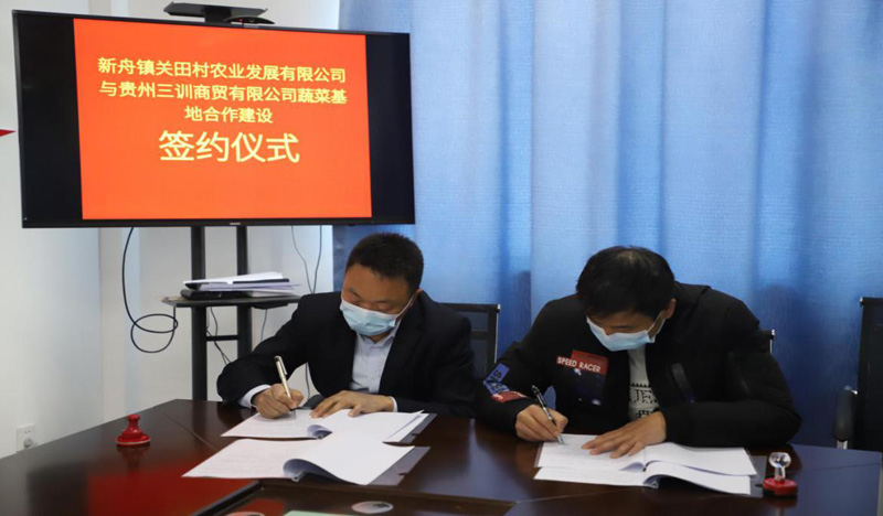 根据公司发展生态农业战略部署,结合贵州省遵义市新蒲新区新舟镇关田村巩固脱贫攻坚成果工作计划,经公司与关田村村委会多次沟通协商,本着“因地制宜、特色产业、长远规划、合作共赢”原则,我公司旗下贵州三训商贸有限公司和关田村村属企业关田村农业发展有限公司就共同打造关田村种养基地(蔬菜种植、禽畜养殖)事宜达成一致协议。2020年4月22日上午在关田村村委会会议室举行签约仪式。关田村村支书吴应军、主任黄国、种植专家陈明刚出席签约仪式,总公司股东代表罗仕银、贵州三训商贸有限公司负责人王训强、贵州陟翔保安有限公司遵义分公司负责人罗晓明参加签约仪式。吴应军与王训强分别代表双方签署合作协议。